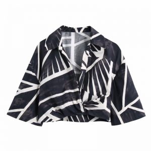 Summer Women Turndown Collar Cross Printed Short Blouse Female Half Sleeve Loose Shirt Casual Lady Crop Tops Blusas S8886